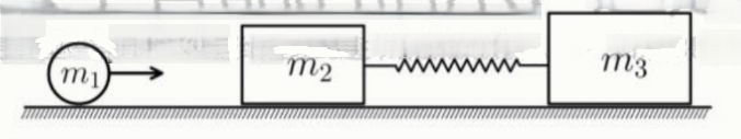 Задание 2. На гладком горизонтальном столе покоятся два бруска: левый массой m₂ = 0,30 кг, правый массой m₃ = 0,50 кг. Бруски соединены идеальной пружиной жесткостью k = 200 Н/м.
